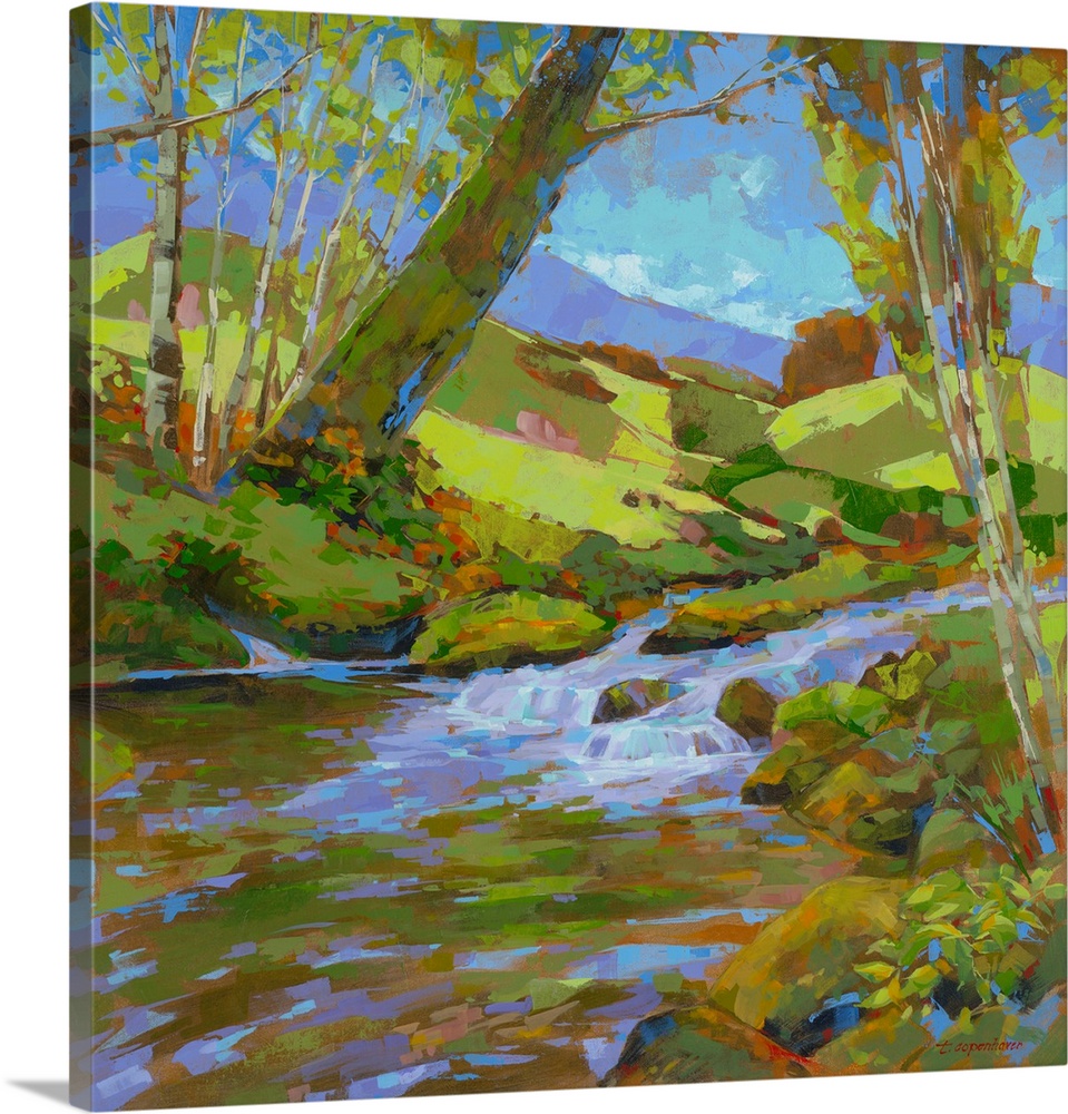 <p>Vibrant landscape painting of a sunlit stream flowing through lush green hills, framed by trees. Bold brushstrokes create a textured, lively scene with bright greens, blues, and distant purple mountains.</p>