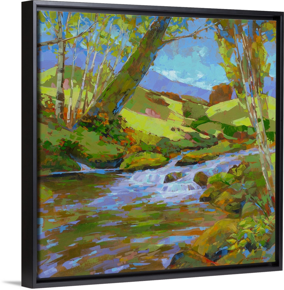 <p>Vibrant landscape painting of a sunlit stream flowing through lush green hills, framed by trees. Bold brushstrokes create a textured, lively scene with bright greens, blues, and distant purple mountains.</p>