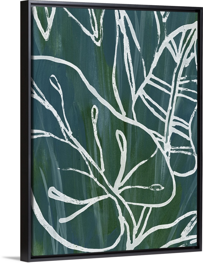 <p>Vertical contemporary artwork featuring tropical leaves in a white outline over a blue and green streaked background.</p>