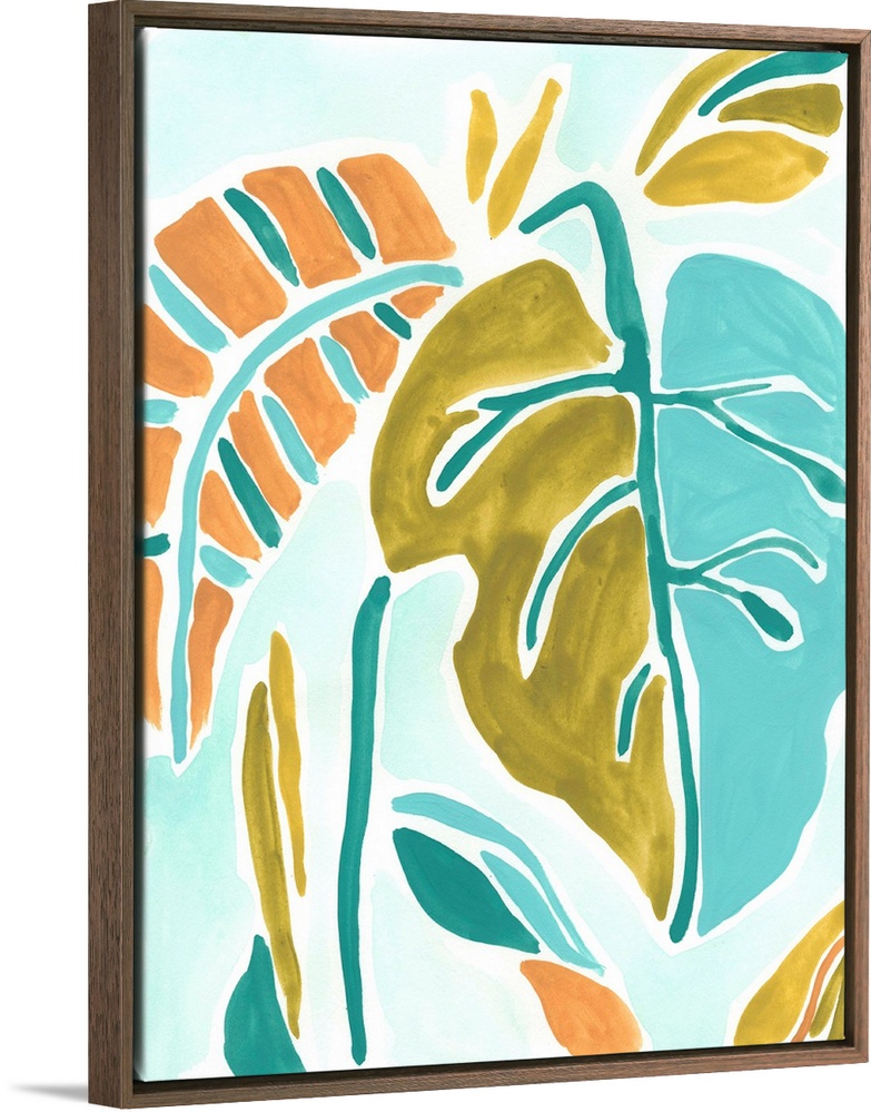 <p>Lively tropical leaves in orange, gold and blue are arranged on a light blue background.</p>
