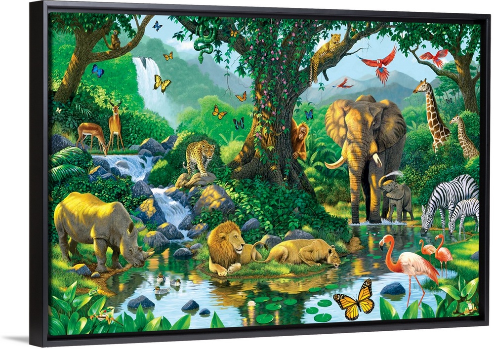 <p>Fantasy painting featuring various jungle animals gathered together at a watering hole beneath the trees.</p>