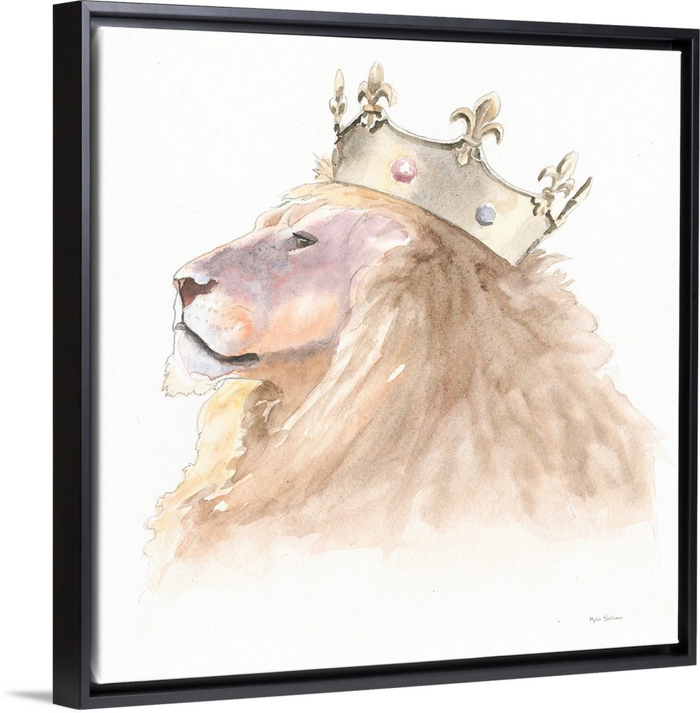 <p>Square watercolor painting of a lion wearing a crown.</p>