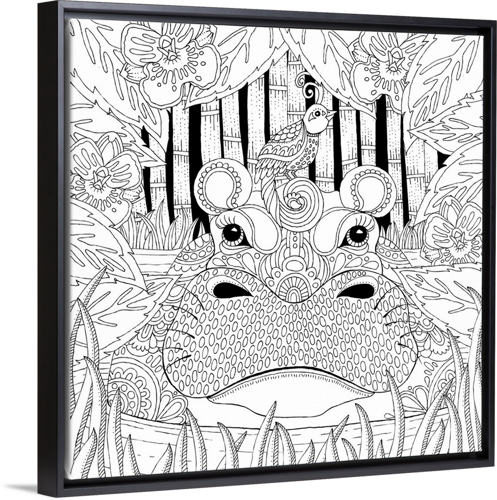 <p>Jungle themed lined art of a hippo in water with a bird on its head surrounded by flowers, grass, and bamboo.</p>