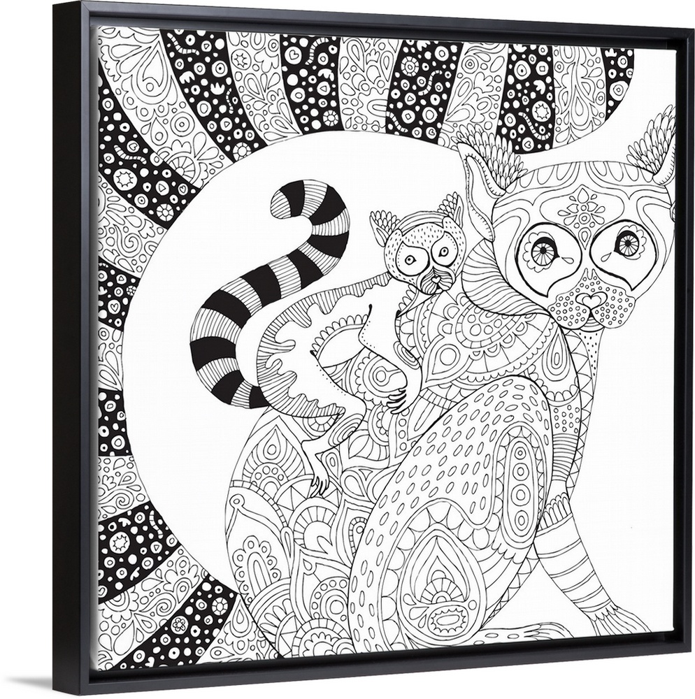 <p>Jungle themed line art of a mother lemur with a baby lemur on her back.</p>