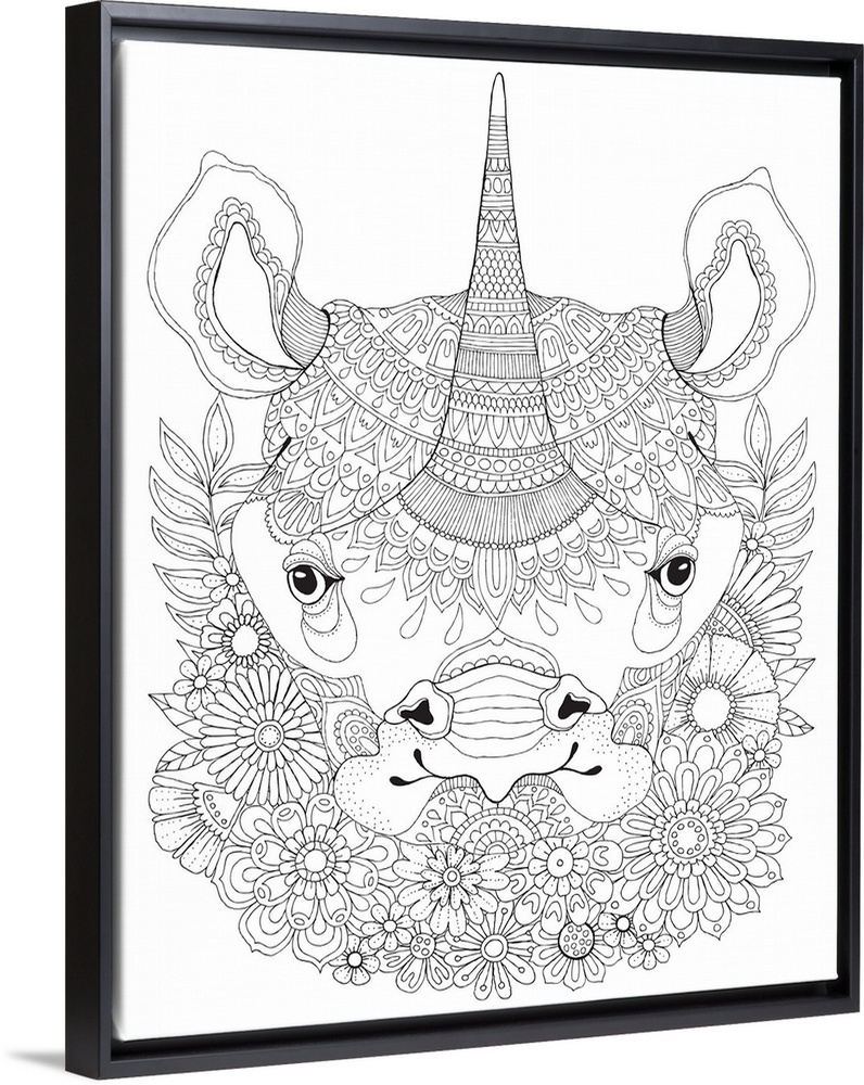 <p>Black and white lined design of a rhinoceros.</p>