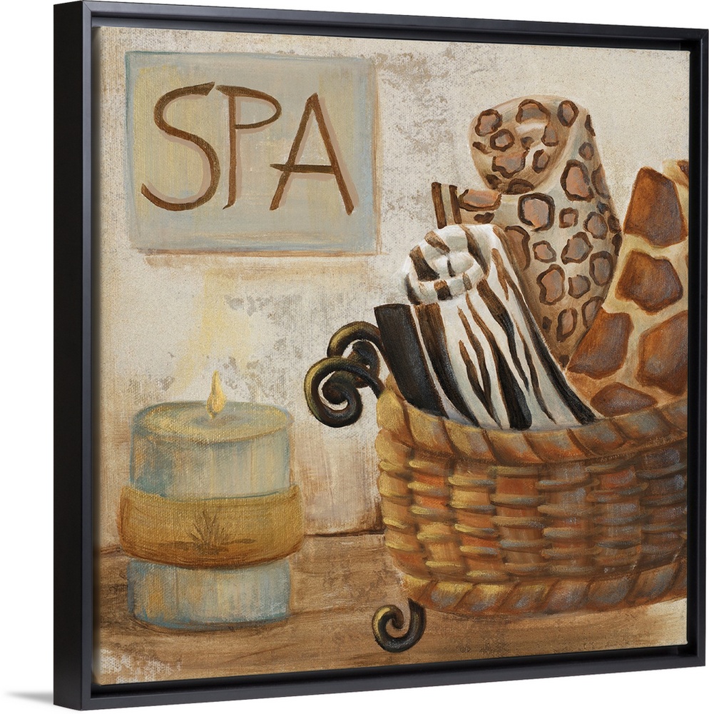 <p>Artwork perfect for the home that has a basket of animal print towels with a candle sitting next to it and a sign just above with "Spa".</p>