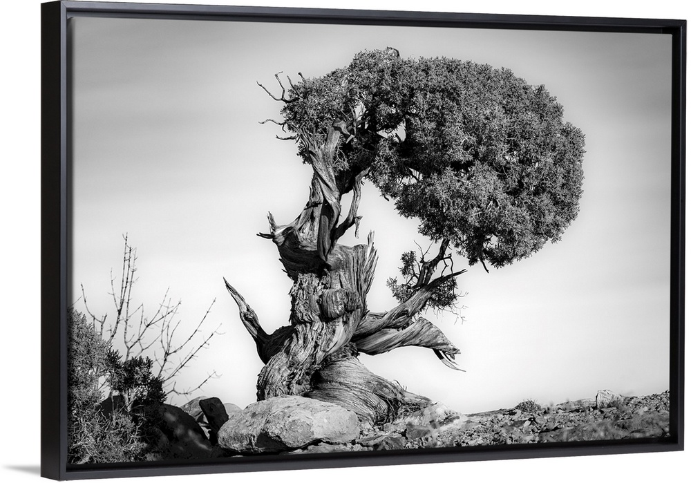 <p>Black and white image of a very old twisted and gnarled Juniper tree in Canyonlands National Park, Moab, Utah, United States of America</p>