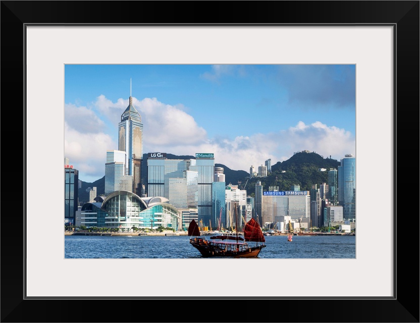 <p>Junk boat passing Convention Centre and Hong Kong Island skyline, Hong Kong, China.</p>