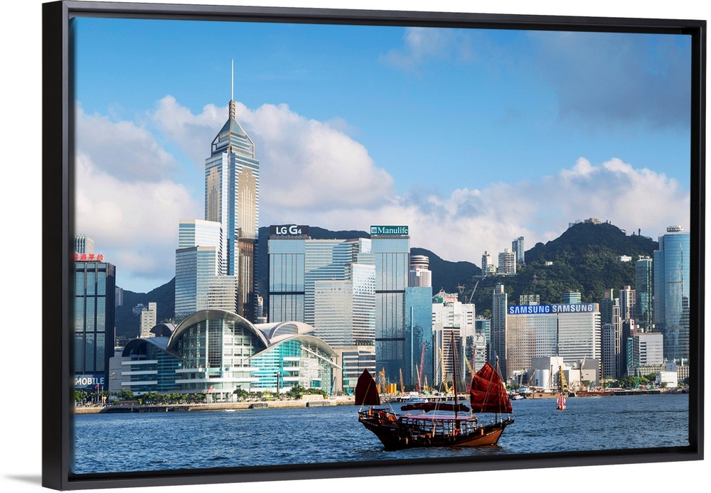 <p>Junk boat passing Convention Centre and Hong Kong Island skyline, Hong Kong, China.</p>