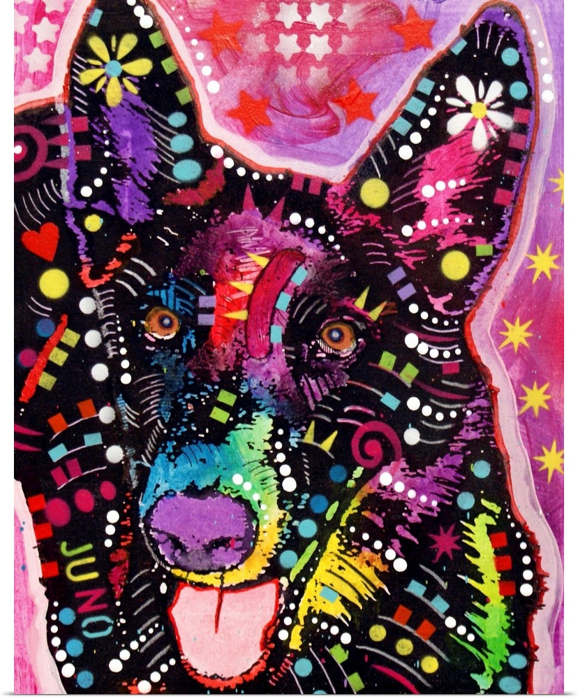 <p>Contemporary stencil painting of a dog filled with various colors and patterns.</p>