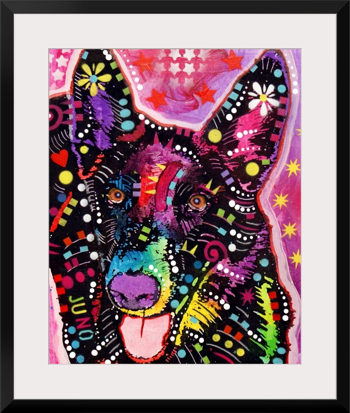 <p>Contemporary stencil painting of a dog filled with various colors and patterns.</p>