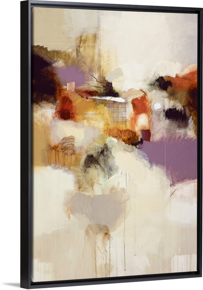<p>Abstract painting featuring patches of soft natural colors and paint drips.</p>