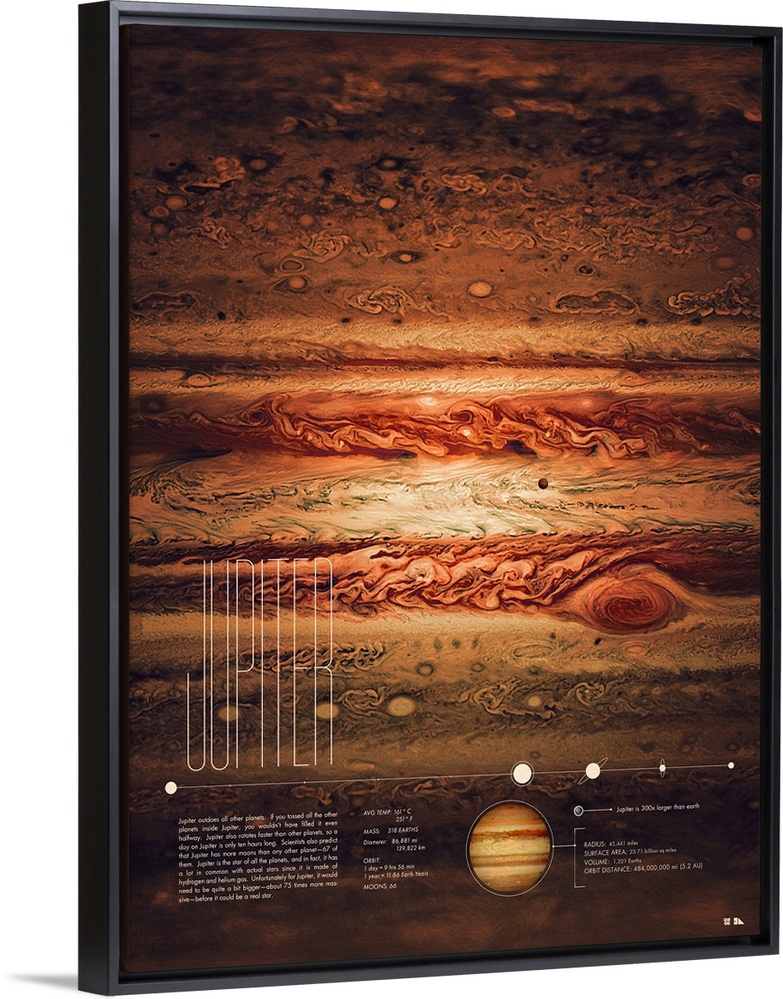 <p>Educational graphic poster of Jupiter with written facts at the bottom including average temperature, mass, diameter, orbit, and a diagram. Write up reads: "Jupiter outdoes all other planets. If you tossed all the other planets inside Jupiter, you wouldn?t have filled it even halfway. Jupiter also rotates faster than other planets, so a day on Jupiter is only ten hours long. Scientists also predict that Jupiter has more moons than any other planet?67 of them. Jupiter is the star of all the planets, and in fact, it has a lot in common with actual stars since it is made of hydrogen and helium gas. Unfortunately for Jupiter, it would need to be quite a bit bigger?about 75 times more massive?before it could be a real star."</p>