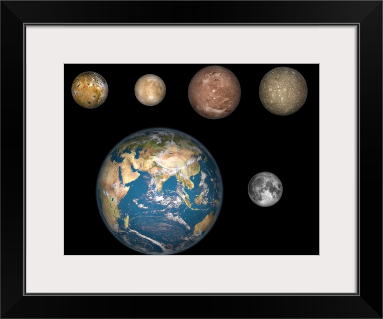 <p>Artist's concept of Jupiter's four largest satellites laid out above the Earth and it's moon.</p>