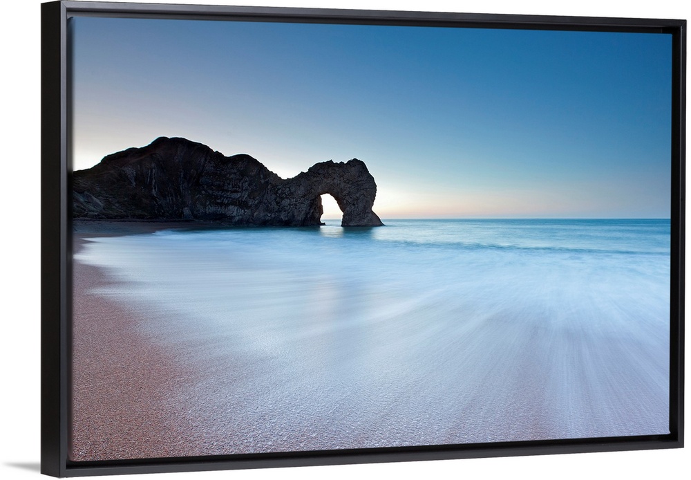 <p>Durdle Door rock arch on the Dorset coast at sunrise with a blue sky and swooshing waves in minimalist energy.</p>