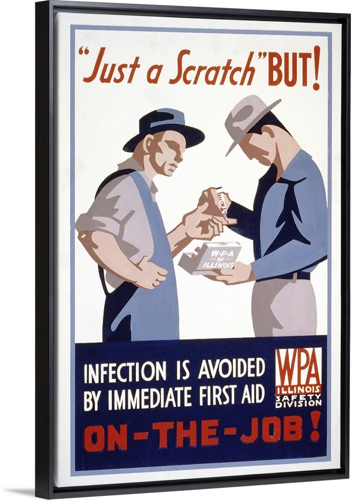 <p>Just a scratch, but! Infection is avoided by immediate first aid on-the-job! Poster for Illinois WPA Safety Division promoting immediate treatment of on-the-job injuries. Library of Congress, Prints and Photographs Division, WPA Poster Collection.</p>