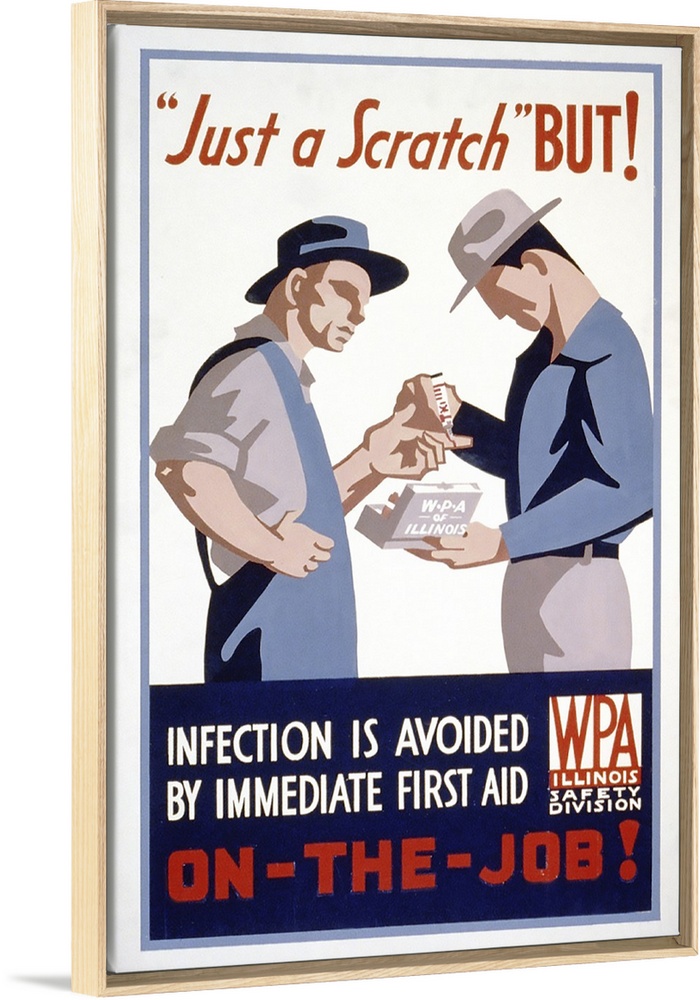 <p>Just a scratch, but! Infection is avoided by immediate first aid on-the-job! Poster for Illinois WPA Safety Division promoting immediate treatment of on-the-job injuries. Library of Congress, Prints and Photographs Division, WPA Poster Collection.</p>