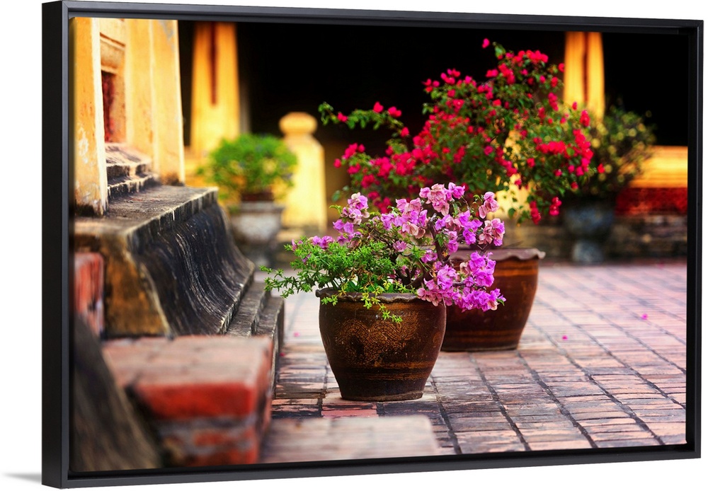 <p>Flower pots at a temple in Asia</p>