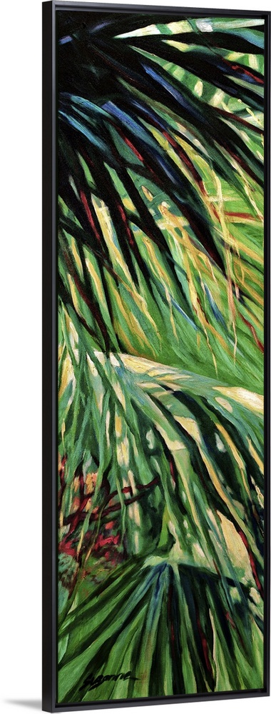 <p>Contemporary colorful painting of a tropical palm frond.</p>
