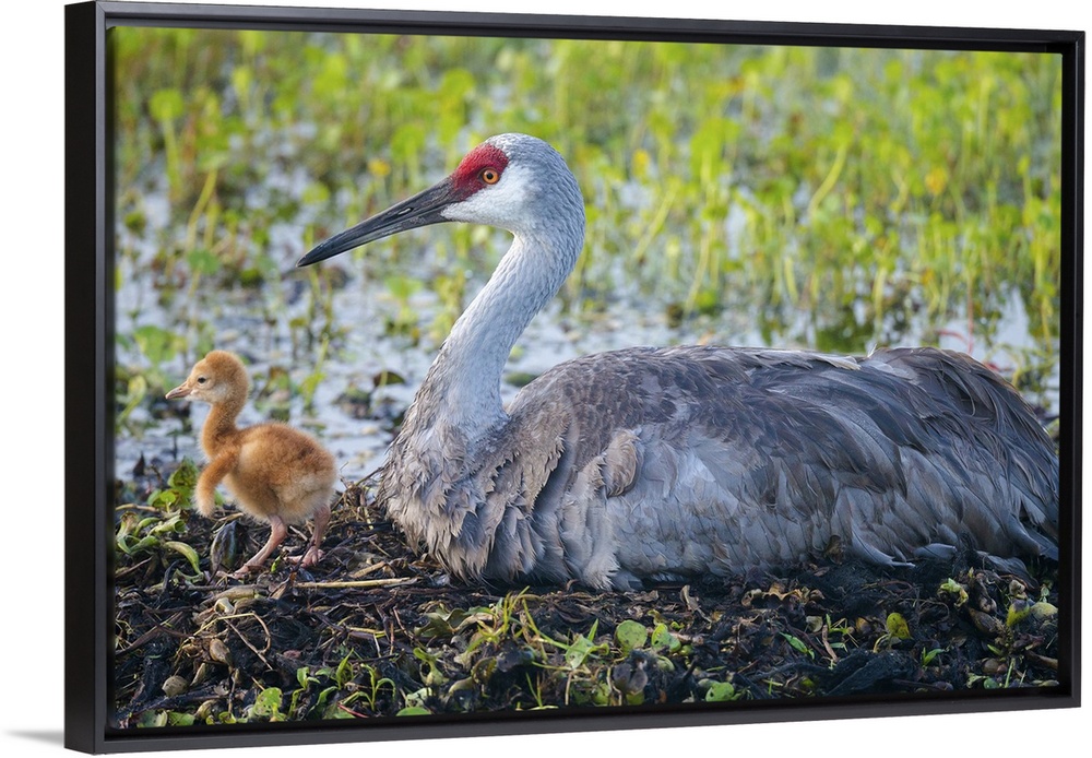 <p>Just hatched, Sandhill crane on nest with first colt, Grus canadensis, Florida, wild</p>