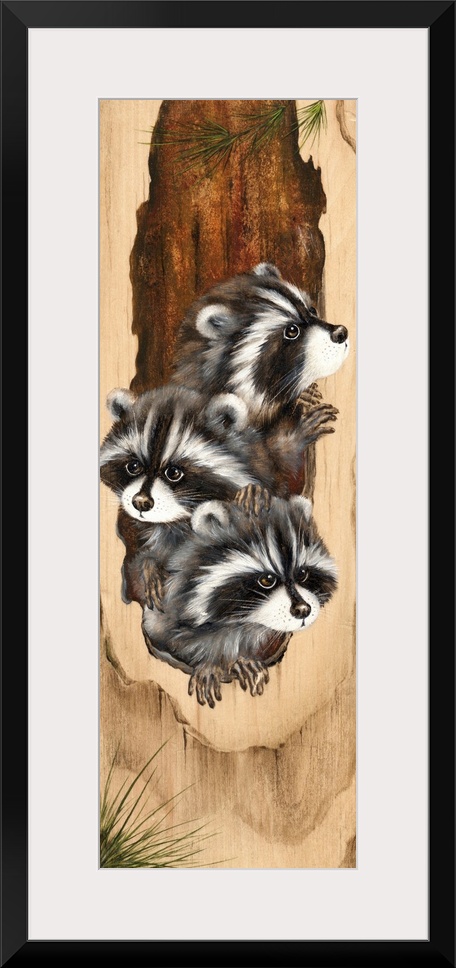 <p>Three baby raccoons peaking out of hollow tree.</p>