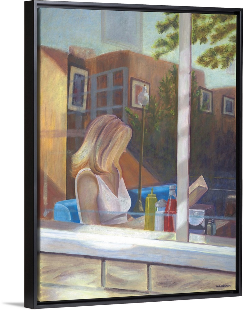 <p>Contemporary painting of a woman reading in a diner, seen through a window.</p>