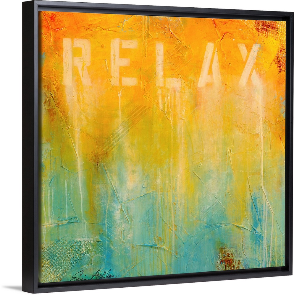 <p>Abstract painting on canvas with a bright gradient of colors running from top to bottom with heavy brush textures and the word "Relax" stenciled on top.</p>