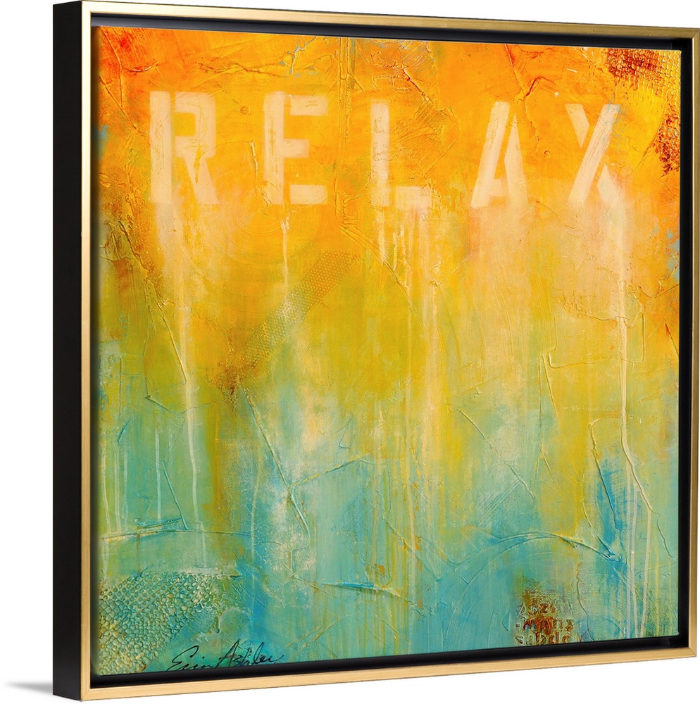 <p>Abstract painting on canvas with a bright gradient of colors running from top to bottom with heavy brush textures and the word "Relax" stenciled on top.</p>