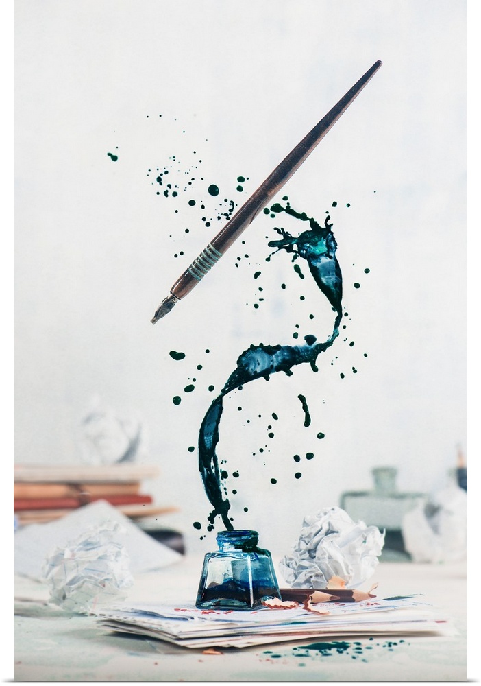 <p>Spilled ink flying above inkwell in a spiraling splash with tiny drops and flying pen on a light background. Still life with writer workplace. Creative writing concept. Dynamic shot with frozen motion.</p>