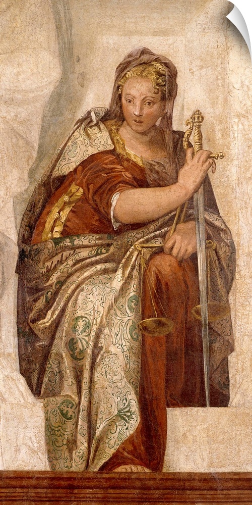 <p>Justice, by Paolo Caliari known as Veronese, 16th Century, fresco. - Italy, Veneto, Castelfranco Veneto Cathedral. Whole artwork view. Allegorical representation of justice with a sword and a scales.</p>