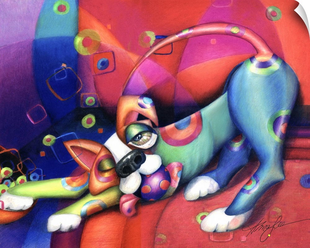 <p>Contemporary artwork in the style of cubism of a stretching dog with a ball in bold colors.</p>