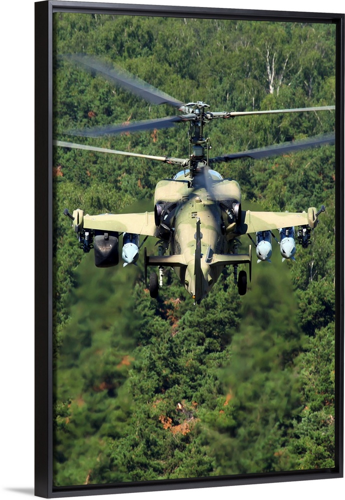 <p>Ka-52 Alligator attack helicopter of the Russian Air Force flying over treetops.</p>