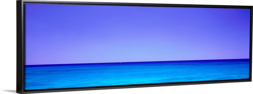 <p>Panoramic photograph displays the clear waters of the Pacific Ocean surrounding an island as a lone boat sits far away in the distance under a cloudless sky.</p>