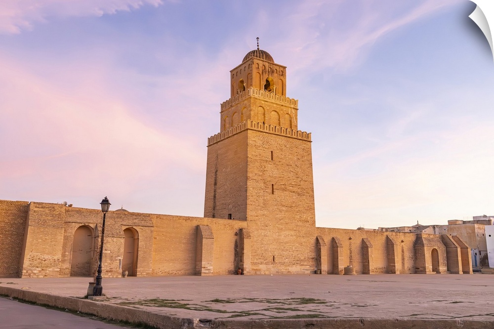<p>Kairouan, Tunisia. Minaret of the Great Mosque of Kairouan at sunset.</p>