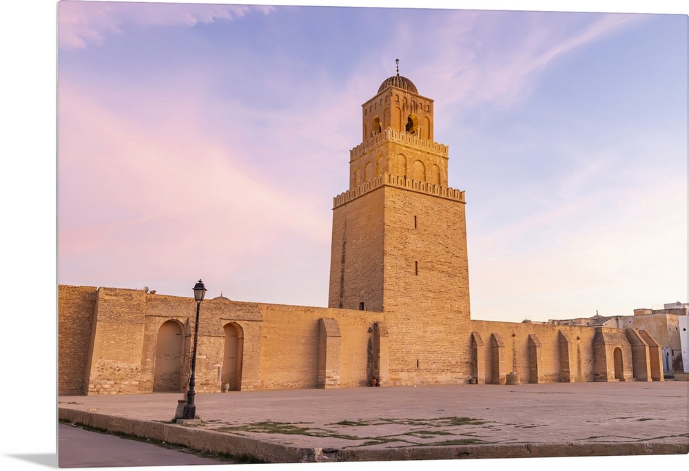 <p>Kairouan, Tunisia. Minaret of the Great Mosque of Kairouan at sunset.</p>