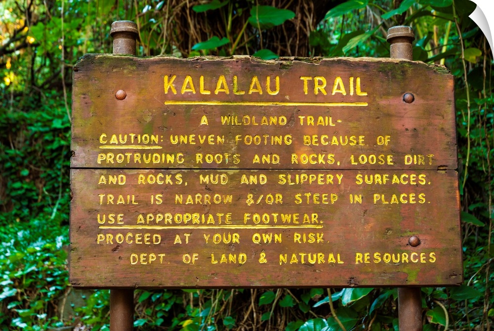 <p>Kalalau Trail sign at the Ke'e Beach trailhead, Na Pali Coast, Island of Kauai, Hawaii USA</p>