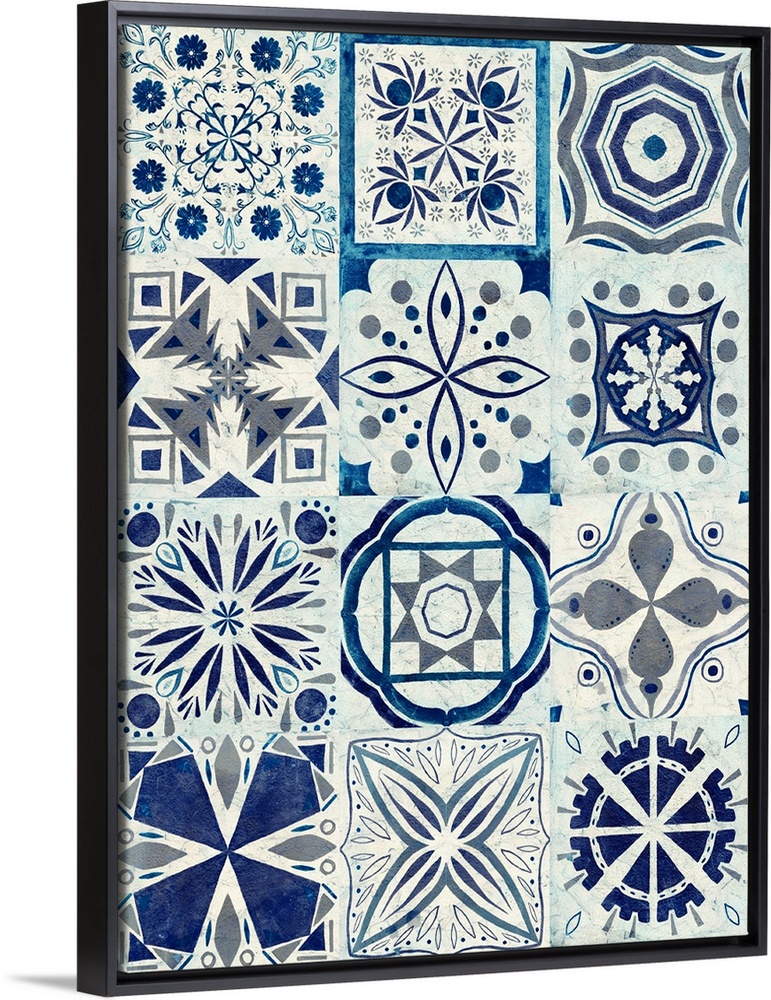 <p>This contemporary artwork is a compilation of fun and exciting tile patterns stacked three by four in shades of blue.</p>