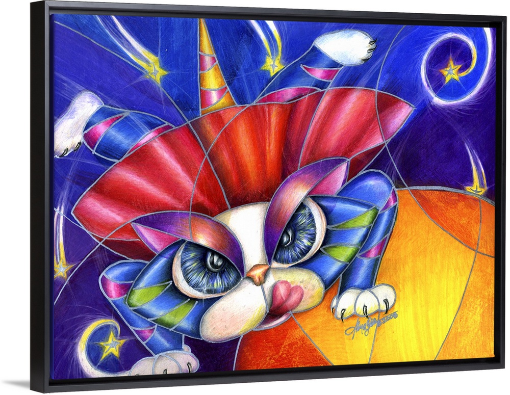 <p>Contemporary artwork in the style of cubism of a stretching cat in bold colors.</p>