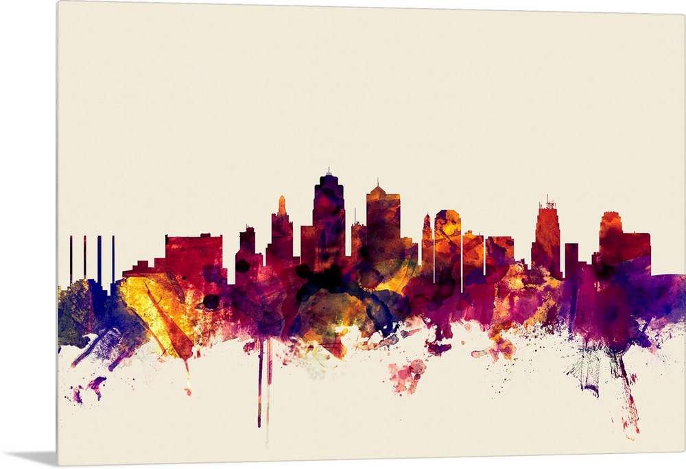 <p>Contemporary artwork of the Kansas City skyline in watercolor paint splashes.</p>