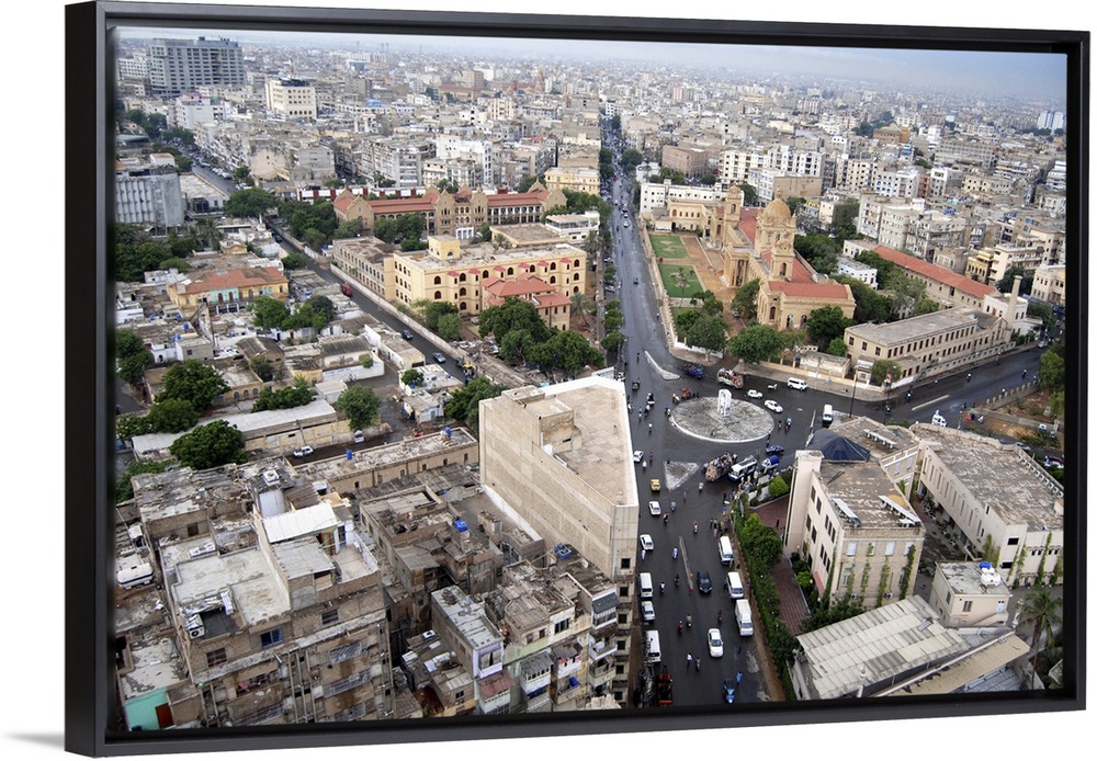 <p>Roundabout, DJ Science College, SM Law College, Memon Masjid, UBL Bank, Cars, Bikes, Cloudy weather.</p>