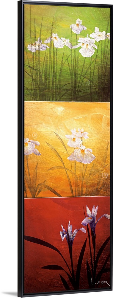 <p>A long vertical painting of flowers in three panels of red, green and yellow.</p>