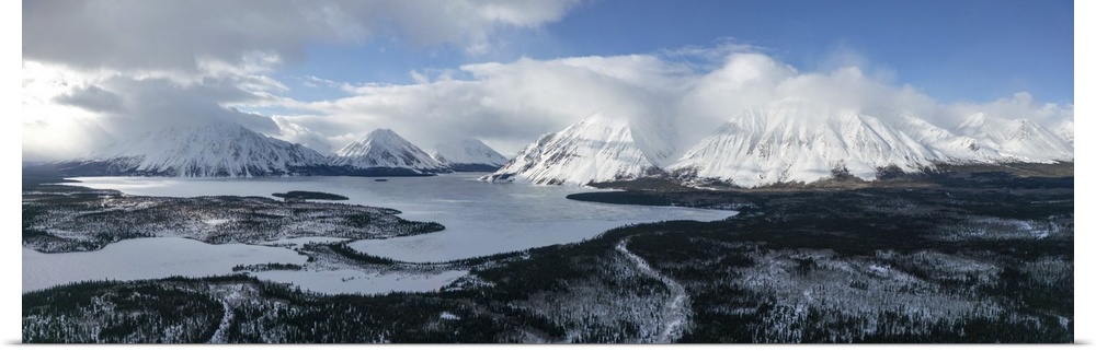 <p>Aerial view of Kathleen Lake with Kings Throne and Mount Worthington looming beside it on a beautiful late winter day; Haines Junction, Yukon, Canada.</p>