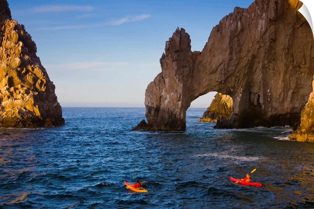 <p>Two people in kayaks paddle in the ocean near tall rock arch formations.</p>