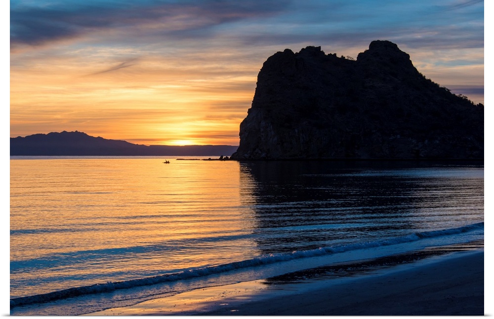 <p>Mexico, Baja California Sur, Sea of Cortez, Loreto Bay. Kayakers paddle out for sunrise past Nopolo Rock. Isla del Carmen beyond.</p>
