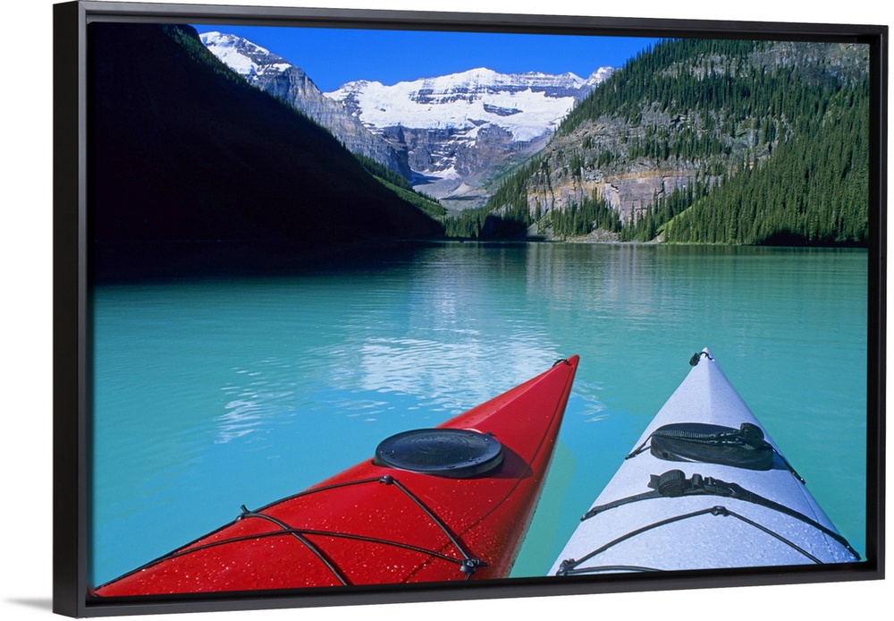 <p>Kayaks on Lake Louise below Mount Victoria in the Canadian Rockies; Banff National Park; Alberta, Canada</p>