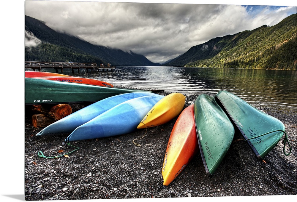 <p>Kayaks on the shore of Lake Crescent.</p>