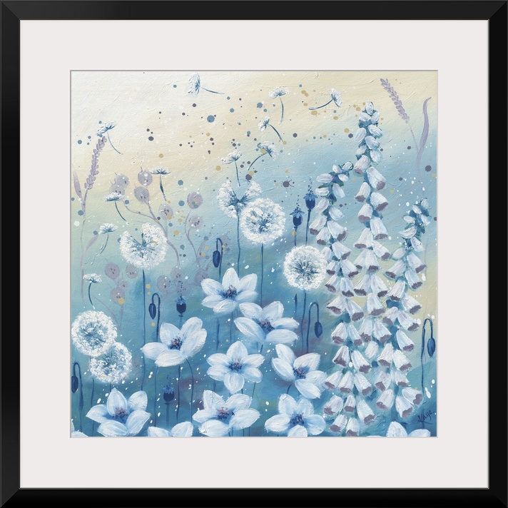 <p>Contemporary artwork of several white dandelions and bluebells on a pastel blue background.</p>