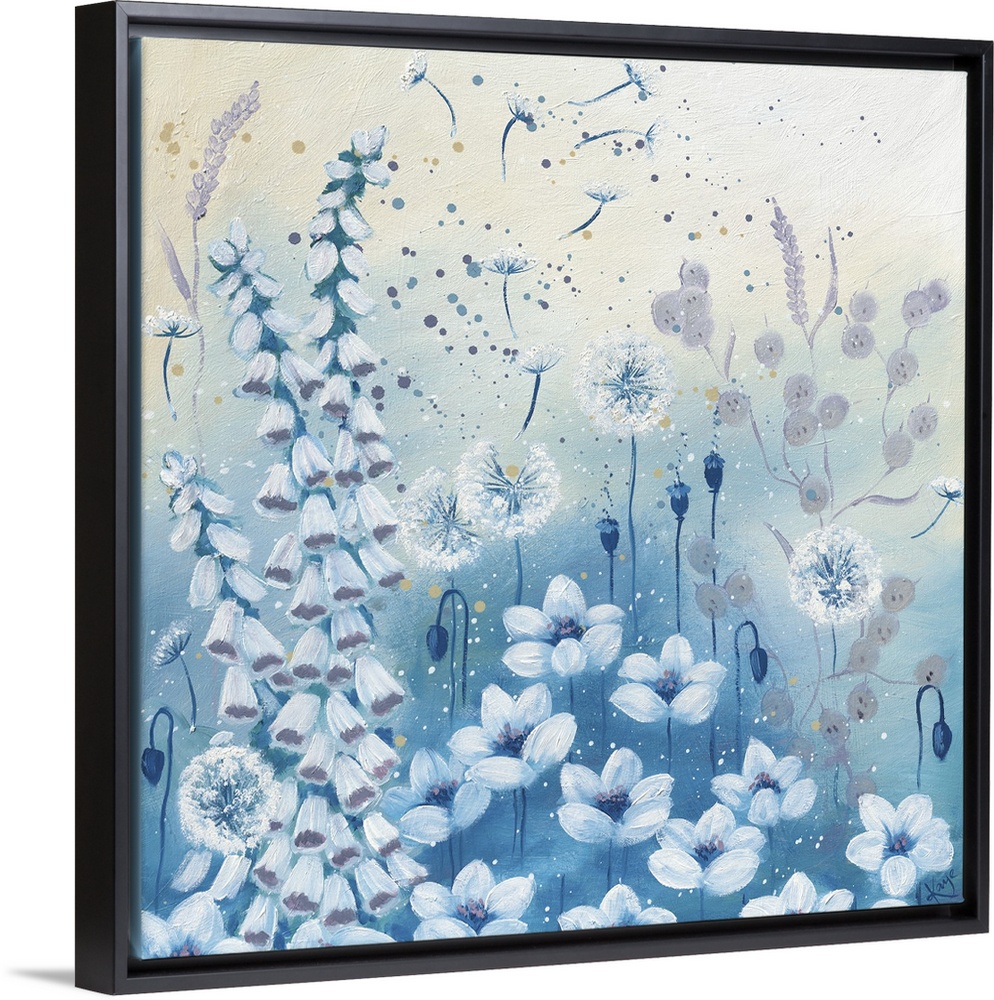 <p>Contemporary artwork of several white dandelions and bluebells on a pastel blue background.</p>