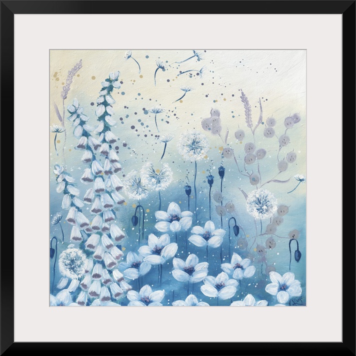 <p>Contemporary artwork of several white dandelions and bluebells on a pastel blue background.</p>