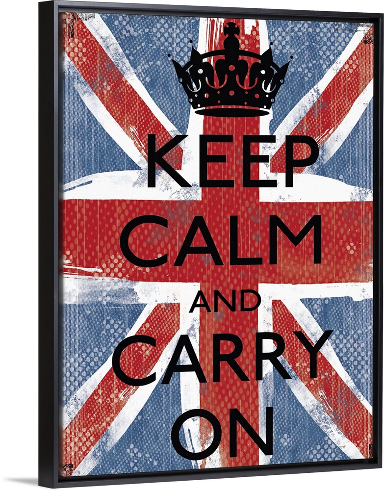 <p>Vertical artwork on a large canvas of a roughly painted British flag, textured with small, repeating circles. A black crown at the top of the image with text underneath that reads "Keep calm and carry on".</p>